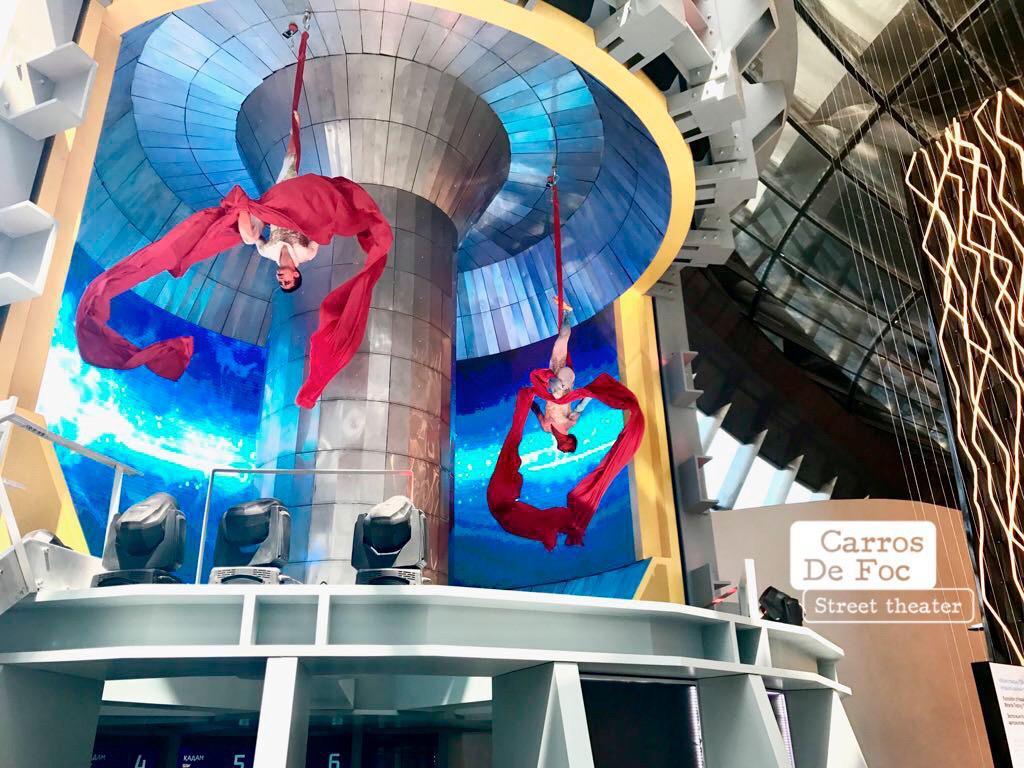 bailarinas, acrobacias en telares aéreos, representan las partículas que crean